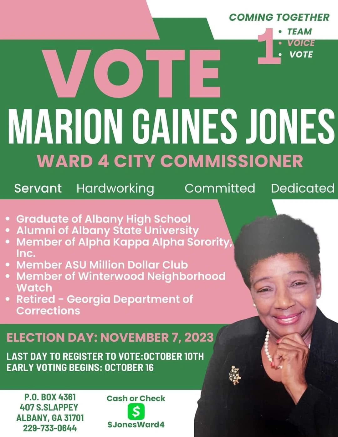 Marion Gaines Jones is the excellent commissioner to work alongside Antonio Screen as Mayor. Her experience and understanding of the personalities and nuances, coupled with Screen's vision and plan for a better Albany, is just what we need to move Albany forward.